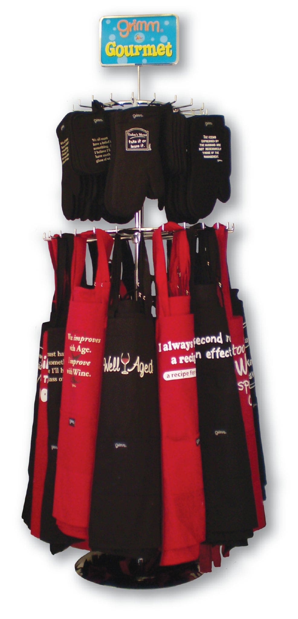 DISPLAY ONLY. Gourmet 2-Tier floor displays 14 apron designs (6 pieces of each), 5 Oven Mitt designs (6 pieces of each), 5 Pot Holder designs (6 pieces of each). Receive 5 aprons free when filled to offset display cost.