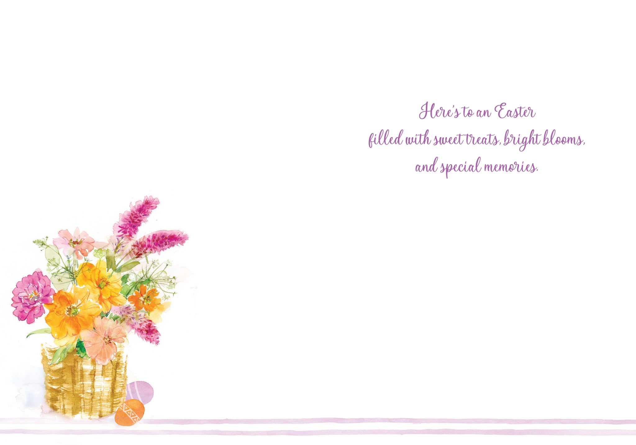 Measures 5″x7″ and is printed in full colour on watercolour paper, comes with a coordinating colour envelope. Printed in Canada. INSIDE: Here’s to an Easter filled with sweet treats, bright blooms, and special memories.