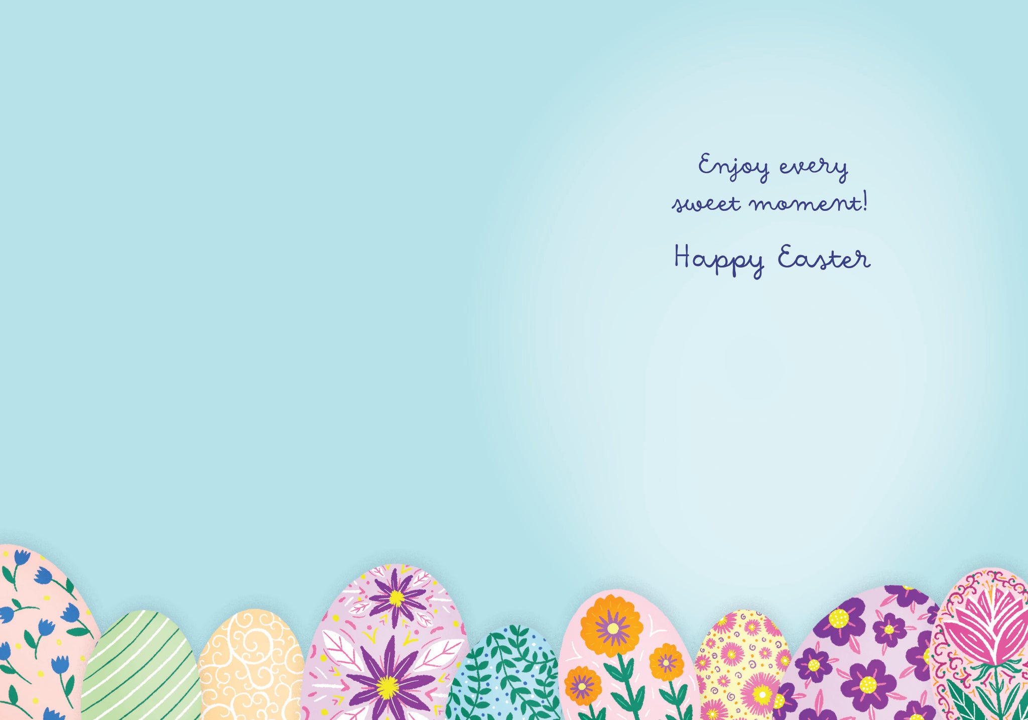 Measures 5″x7″ and is printed in full colour on linen paper, comes with a coordinating colour envelope. Printed in Canada. INSIDE: Enjoy every sweet moment! Happy Easter
