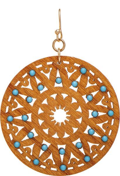 Brown Wood Turquoise Blue Bead Medallion Earring. Product materials may include zinc, brass and steel with silver and rhodium plating. Lead safe. Ear wires made of stainless steel with silver or gold plating.