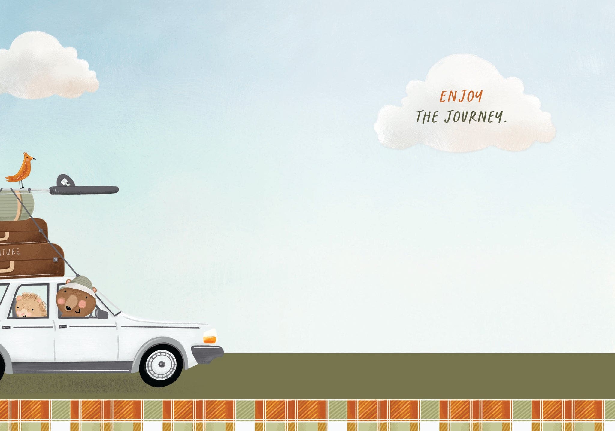 Each card measures 5″x7″ (13cmx18cm) and is printed in full colour on smooth paper, comes with a coordinating colour envelope. Printed in Canada. Inside greeting: Enjoy the journey.