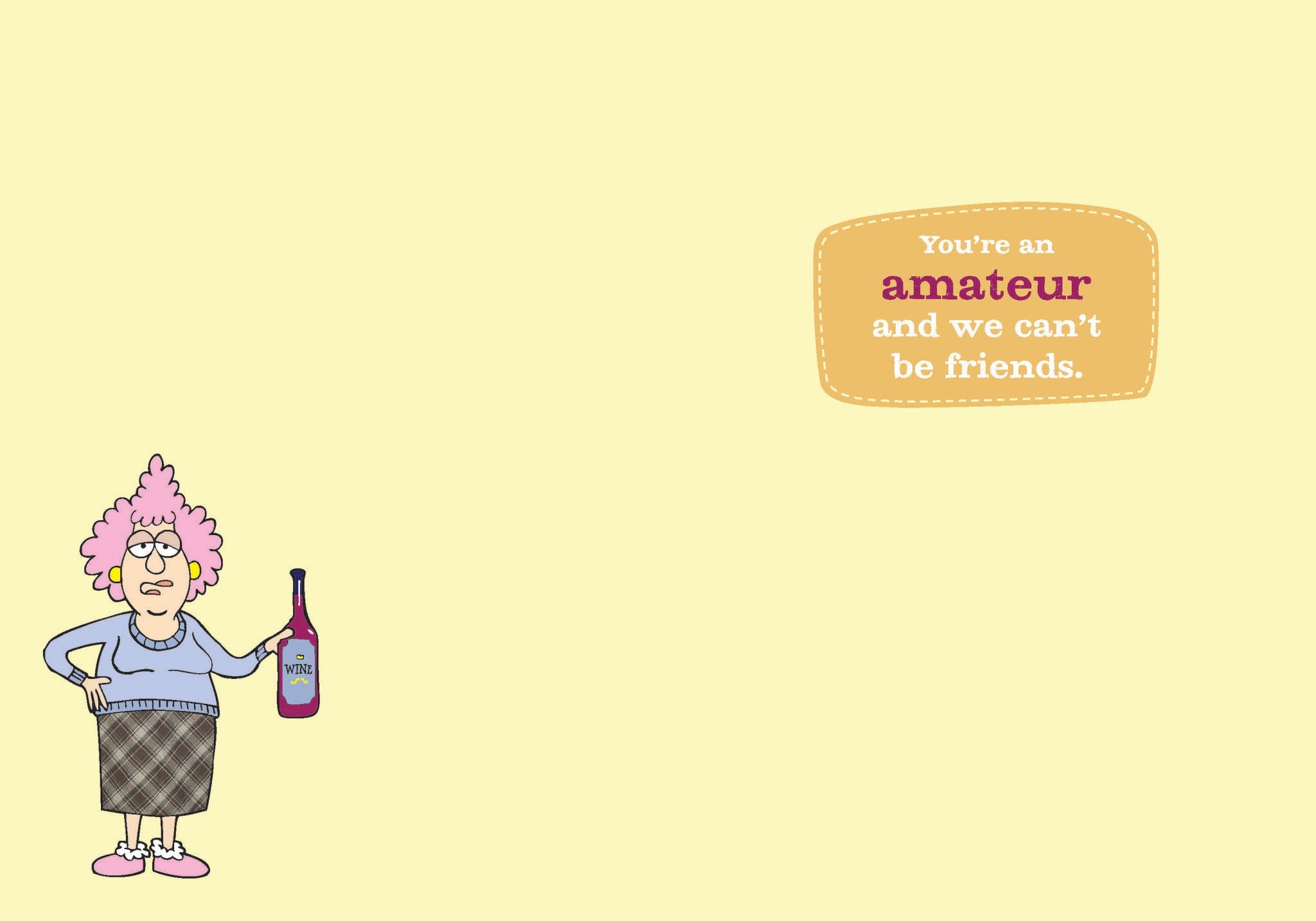 Each card measures 5″x7″ (13cmx18cm) and is printed in full colour on coated paper, comes with a coordinating colour envelope. Printed in Canada. INSIDE: You’re an amateur and we can’t be friends.