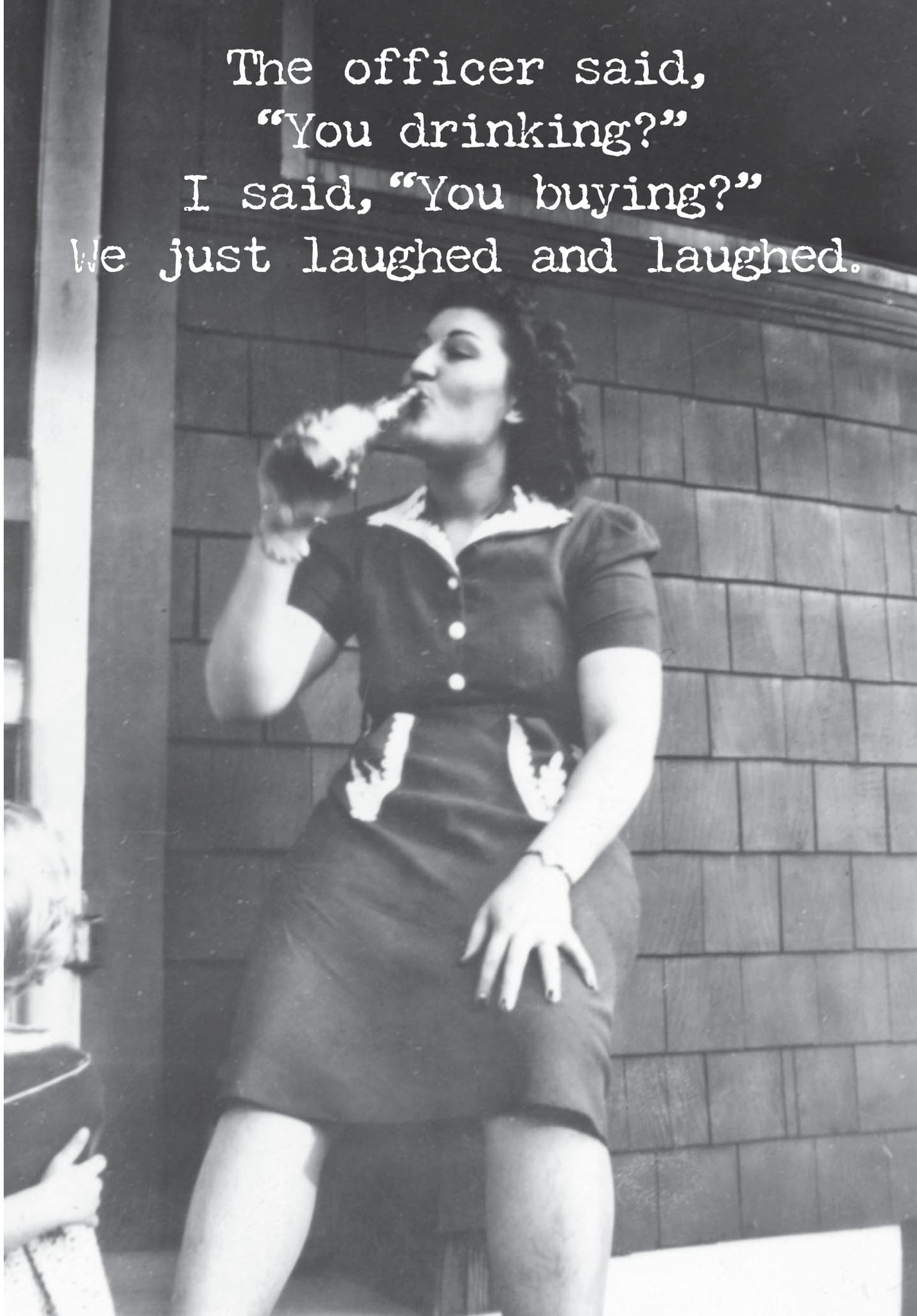 A humorous 4.75″ x 7″ greeting card lending a vintage photograph to coordinate with its outside. INSIDE: Let’s get together soon. Bring bail money. Printed in Canada.