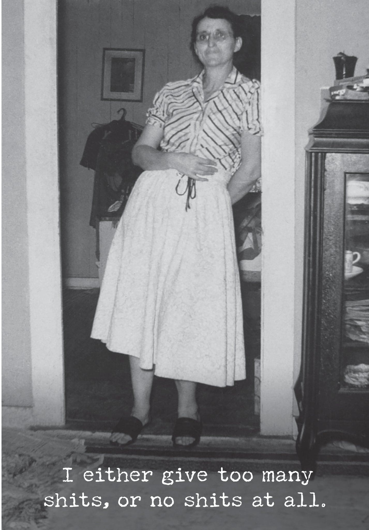 A humorous 4.75″ x 7″ greeting card lending a vintage photograph to coordinate with its outside. INSIDE: I can’t seem to find a middle ground for moderate shit distribution. Printed in Canada.