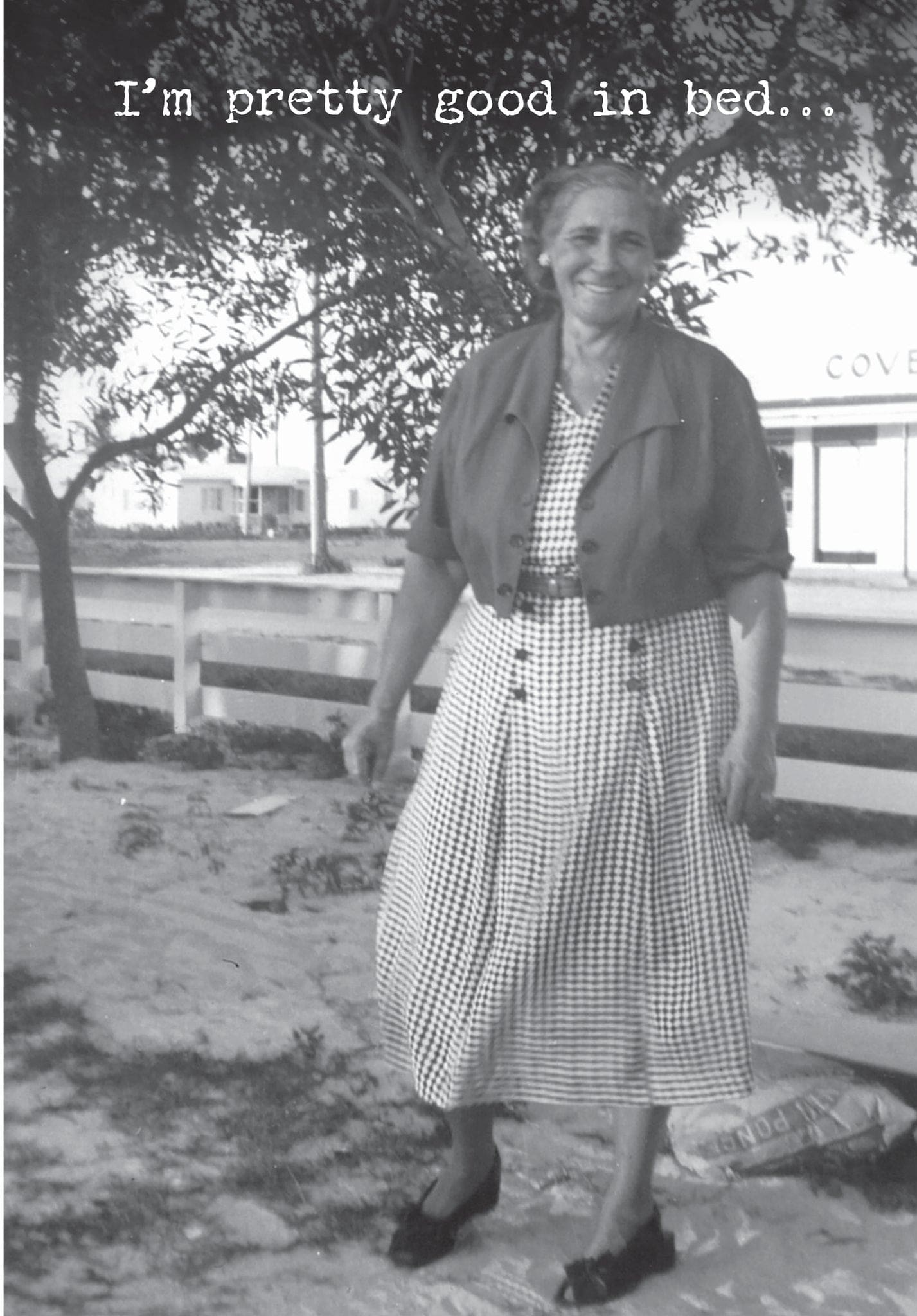 A humorous 4.75″ x 7″ greeting card lending a vintage photograph to coordinate with its outside. INSIDE: I hardly ever fall out anymore. Printed in Canada.