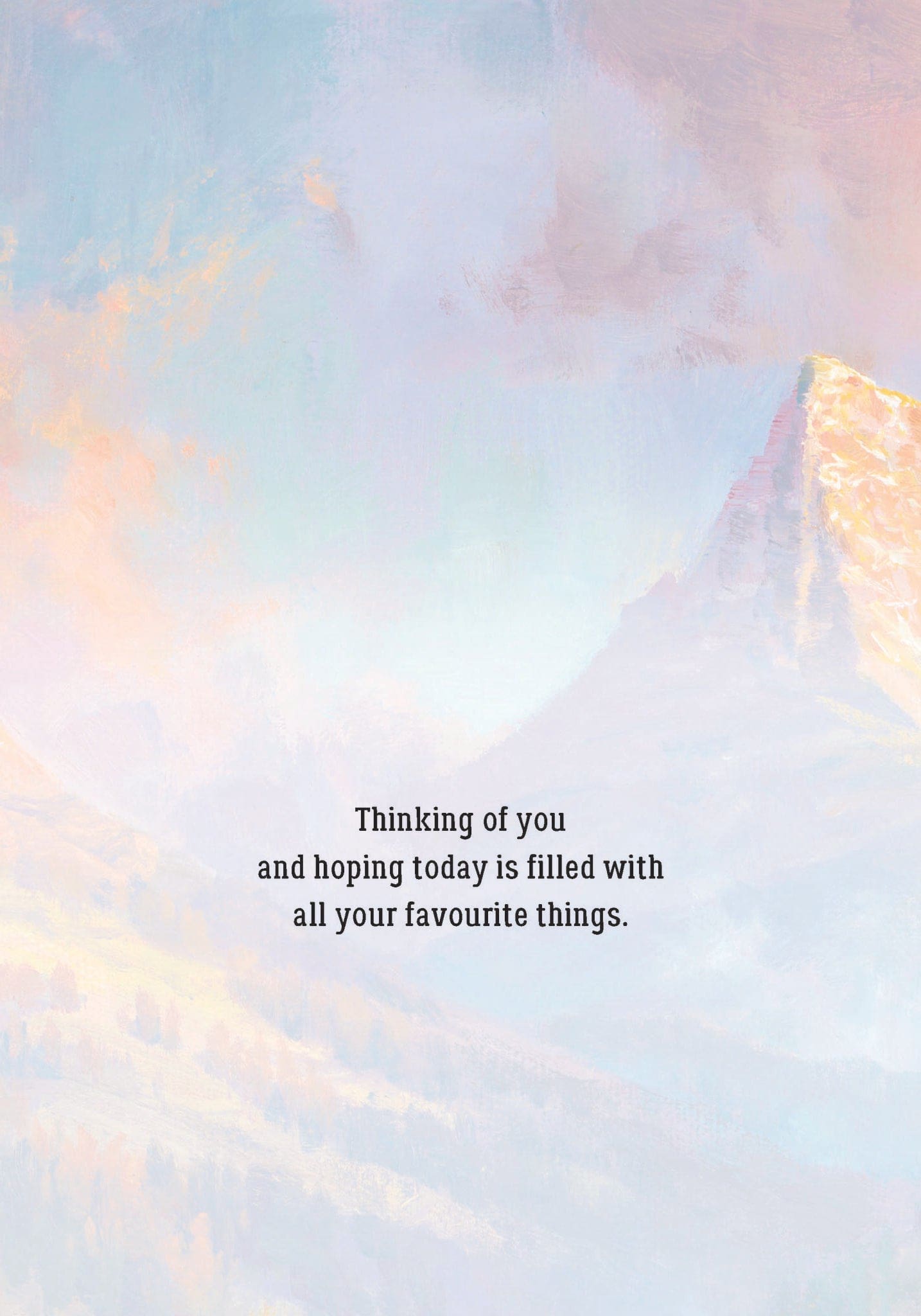 Each card measures 5″x7″ (13cmx18cm) and is printed in full colour on linen paper, comes with a coordinating colour envelope. Printed in Canada. INSIDE: Thinking of you and hoping today is filled with all your favourite things.