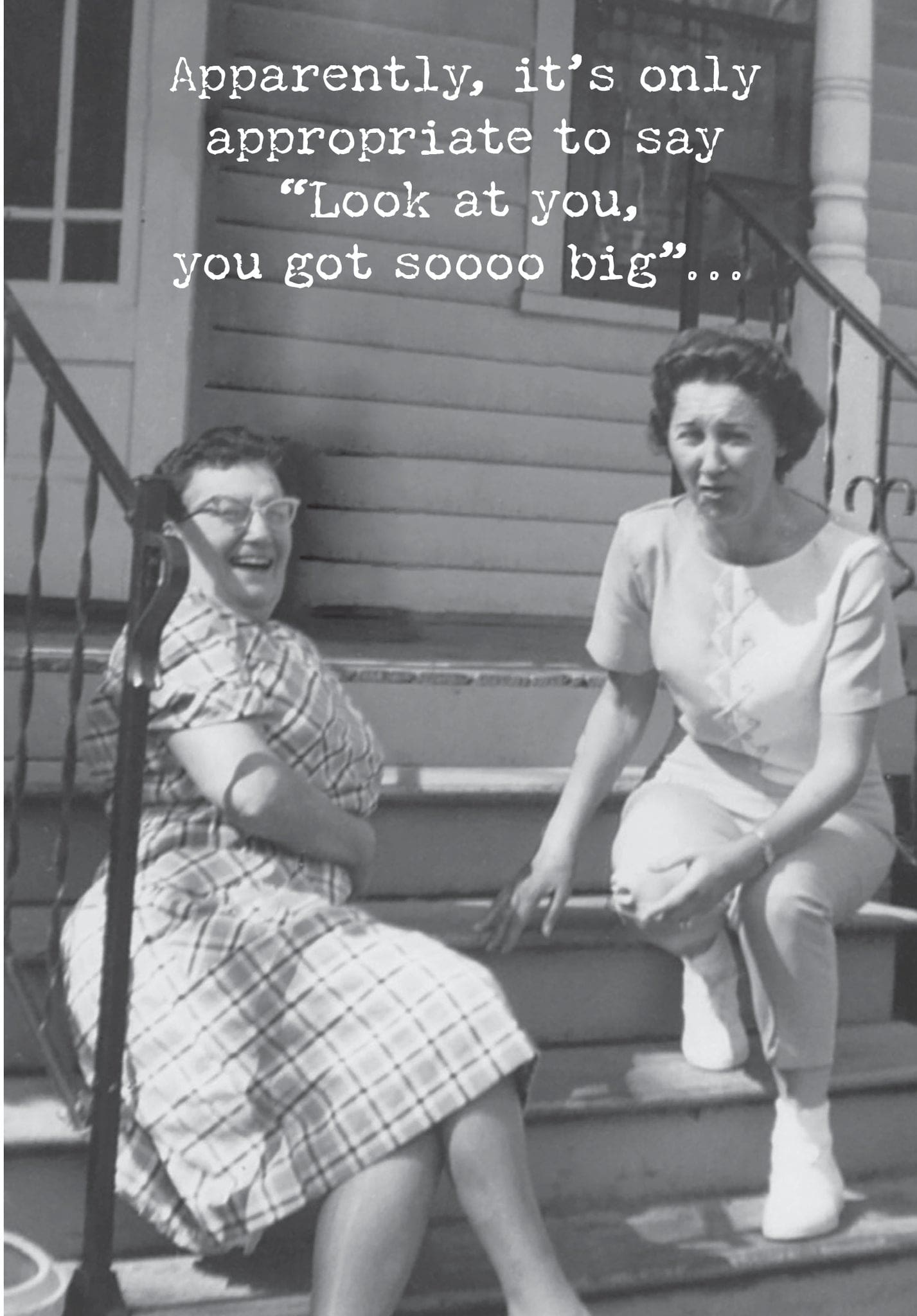 A humorous 4.75″ x 7″ greeting card lending a vintage photograph to coordinate with its outside. INSIDE: To small children and babies. Everyone else tends to get pissed off. Printed in Canada.