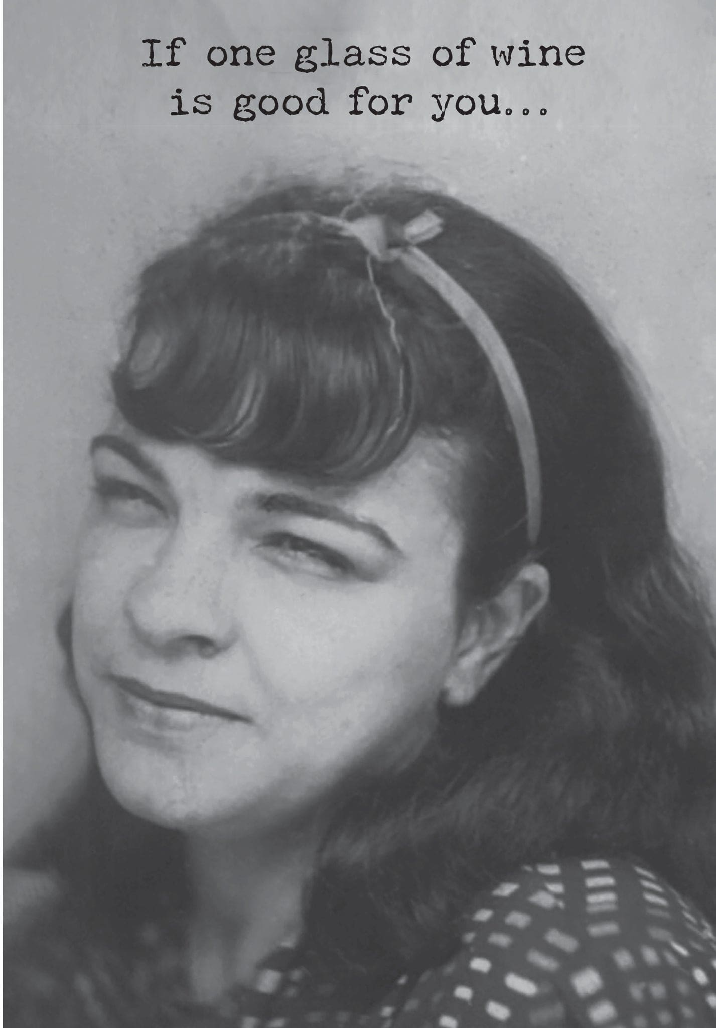 A humorous 4.75″ x 7″ greeting card lending a vintage photograph to coordinate with its outside. INSIDE: Image what the whole bottle could do! Printed in Canada.