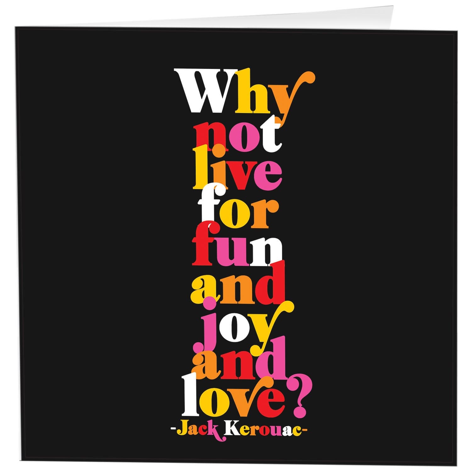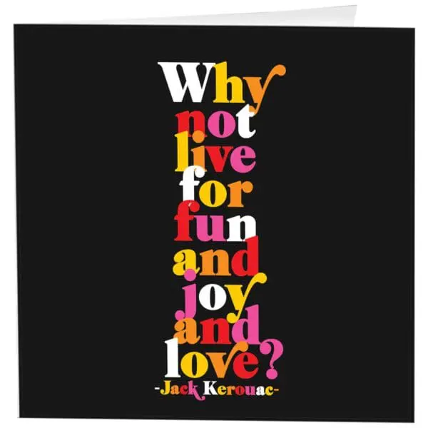 5″ square greeting card. Printed in Canada on recycled paper. Inside: why not live for fun and joy and love?