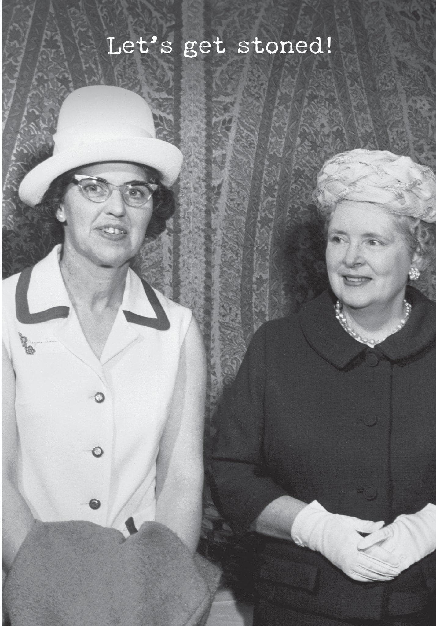 A humorous 4.75″ x 7″ greeting card lending a vintage photograph to coordinate with its outside. INSIDE: I mean… Let’s get a nice bottle of wine and some fancy cheese. Printed in Canada.