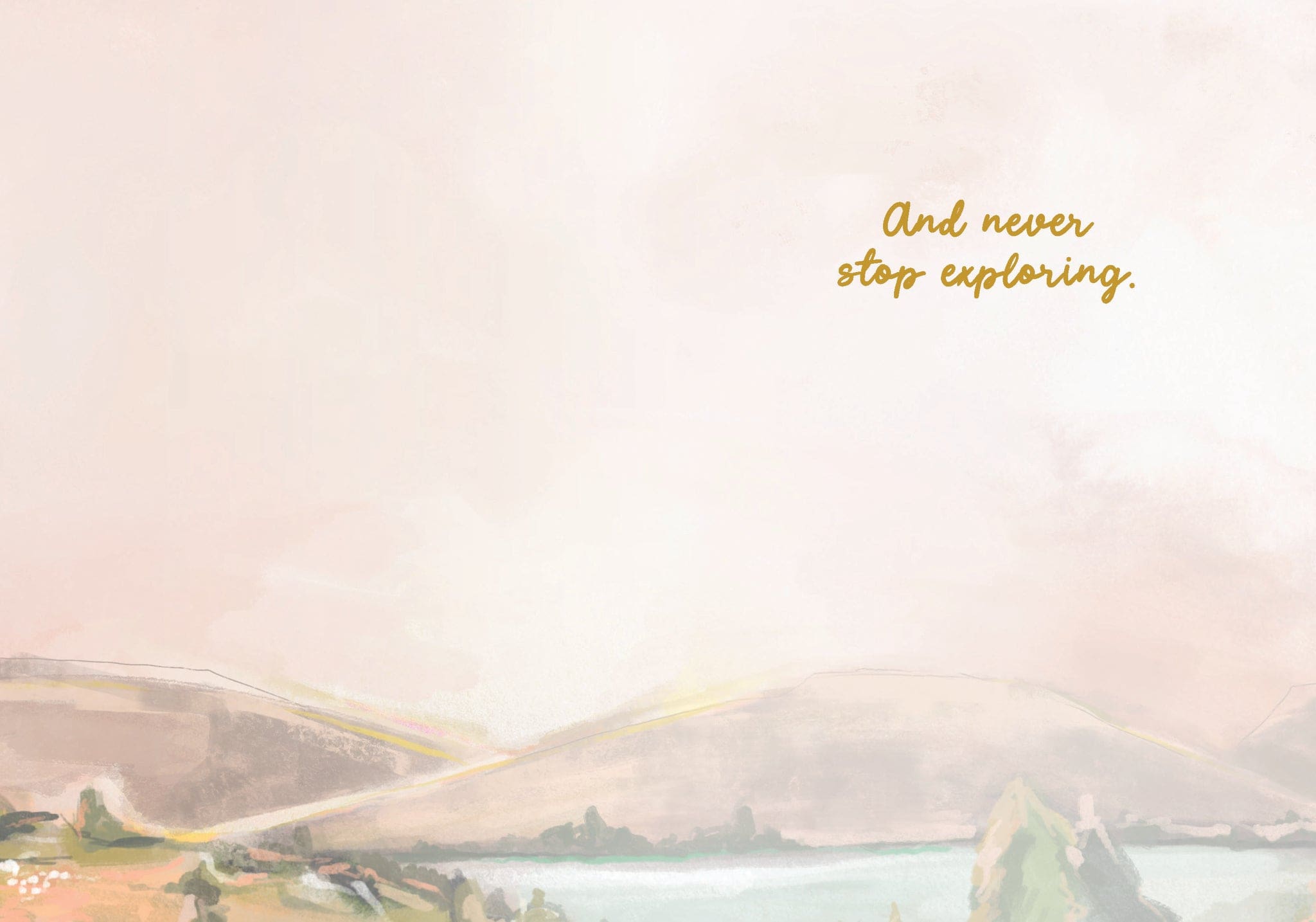 Each card measures 5″x7″ (13cmx18cm) and is printed in full colour on smooth paper, comes with a coordinating colour envelope. Printed in Canada. Inside greeting: And never stop exploring.