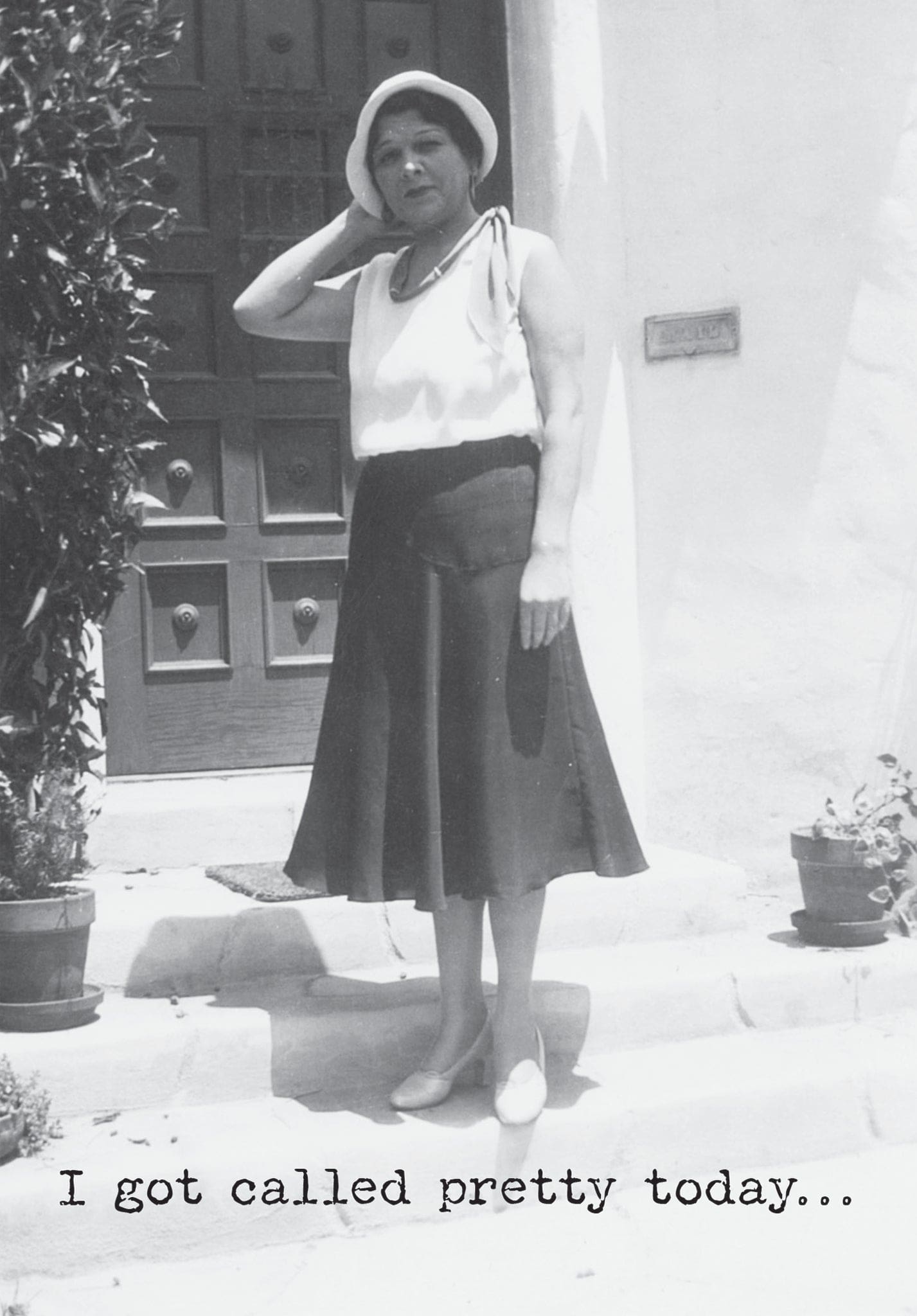 A humorous 4.75″ x 7″ greeting card lending a vintage photograph to coordinate with its outside. INSIDE: well…actually they said, “You’re pretty annoying” but I try to focus on the positive. Printed in Canada.