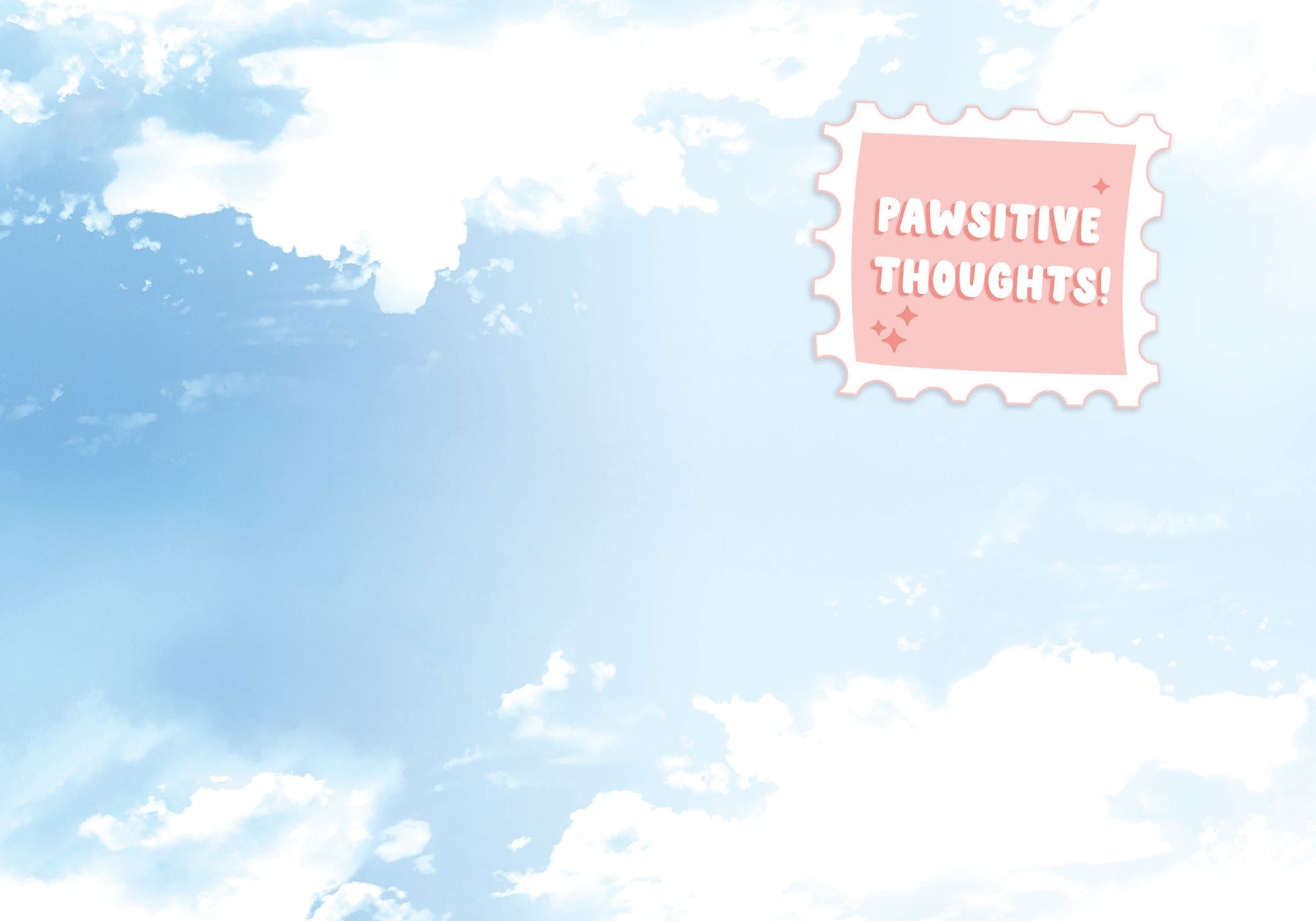 Each card measures 5″x7″ (13cmx18cm) and is printed in full colour on coated paper, comes with a coordinating colour envelope. Printed in Canada. Inside greeting: pawsitive thoughts!