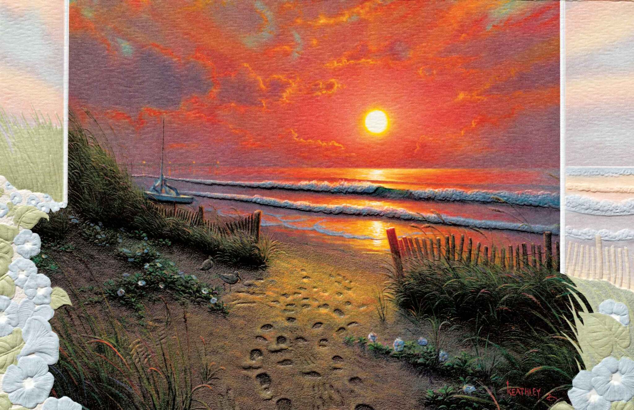 Gorgeous, embossed greeting card measures 8-1/4″ x 5-3/8″. Inside greeting: Thinking of you and praying that the grace of God will give you strength to carry you through this difficult time.