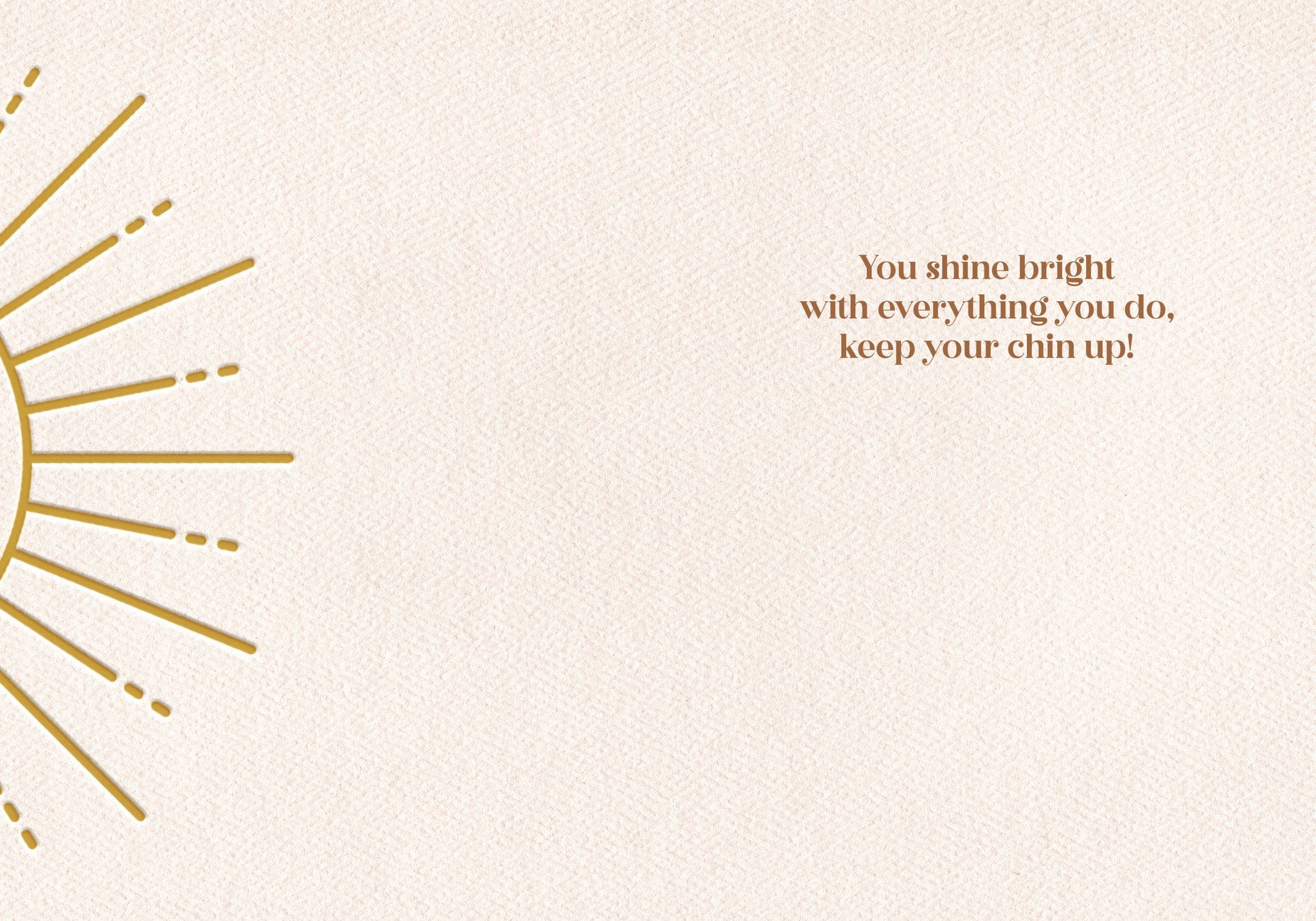 Each card measures 5″x7″ (13cmx18cm) and is printed in full colour on linen paper, comes with a coordinating colour envelope. Printed in Canada. Inside greeting: You shine bright with everything you do, keep your chin up!