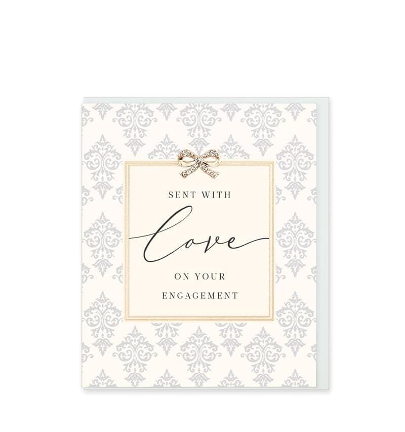 Mad Dots Diamond Collection. This 5″ x 6″ greeting card is printed on cardstock, features gold foil details and is embellished with a diamante bow. Cellophane wrapped with a baby blue envelope. Made in England. INSIDE: Blank