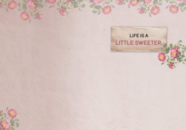 Each card measures 5″x7″ (13cmx18cm) and is printed in full colour on coated paper, comes with a coordinating colour envelope. Printed in Canada. Inside greeting: Life is a little sweeter.