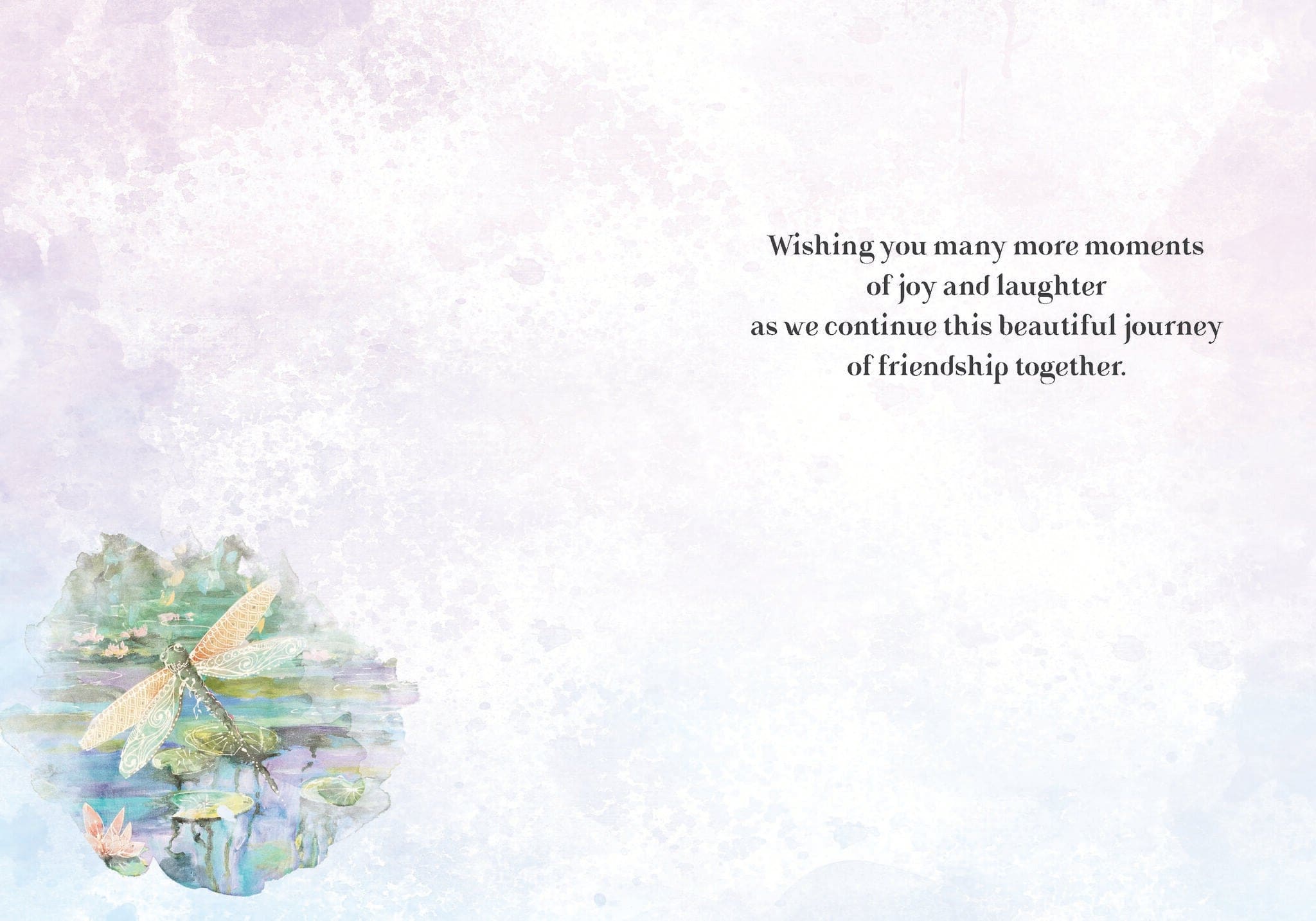 Each card measures 5″x7″, printed in full col on watercolour paper, comes with a coordinating col envelope. Printed in Canada. Inside: Wishing you many more moments of joy and laughter, as we continue this beautiful journey of friendship together.