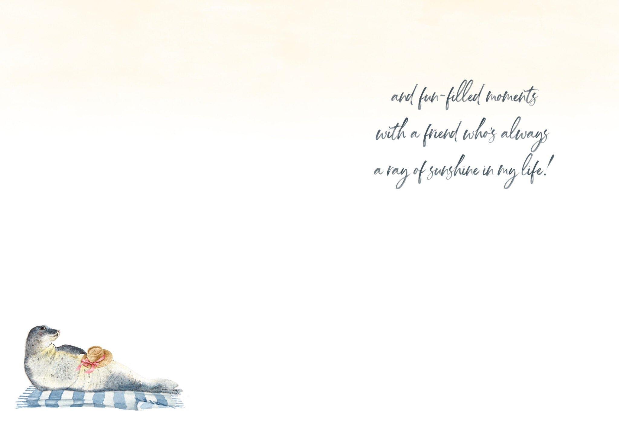 Full size card measuring 5×7″ is printed in Canada with full colour on the interior & exterior. Each card includes an envelope and wrapped in cellophane. INSIDE: and fun-filled moments with a friend who’s always a ray of sunshine in my life!