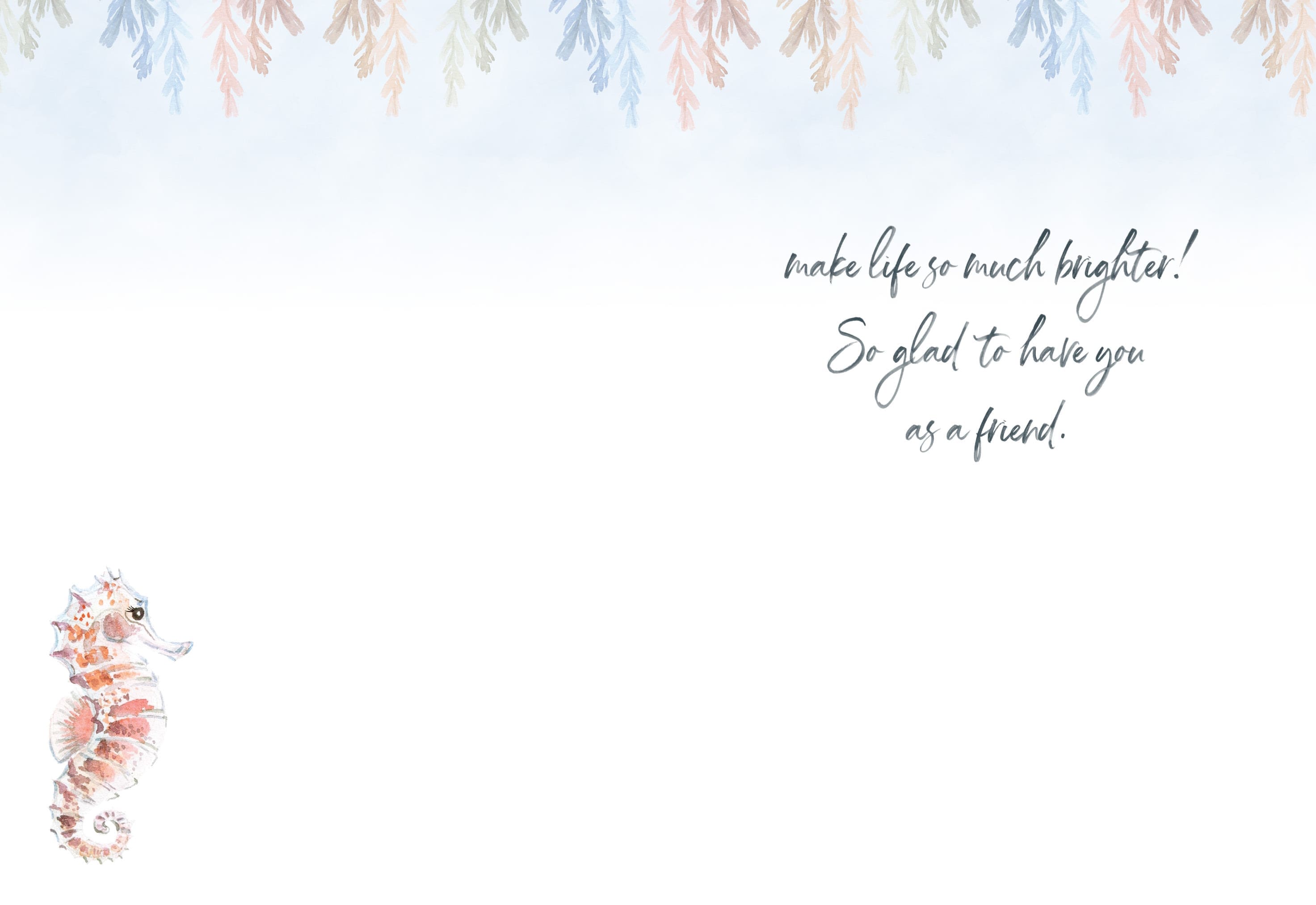 Full size card measuring 5×7″ is printed in Canada with full colour on the interior & exterior. Each card includes an envelope and wrapped in cellophane. INSIDE: so much brighter! So glad to have you as a friend.