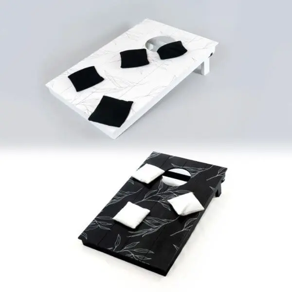 This set in white and black includes both boards, and 8 bean bags for endless fun. The legs fold down for flat storage. Measuring 19.75″x 31″x 2.5. Not weatherproof, for indoor use only.