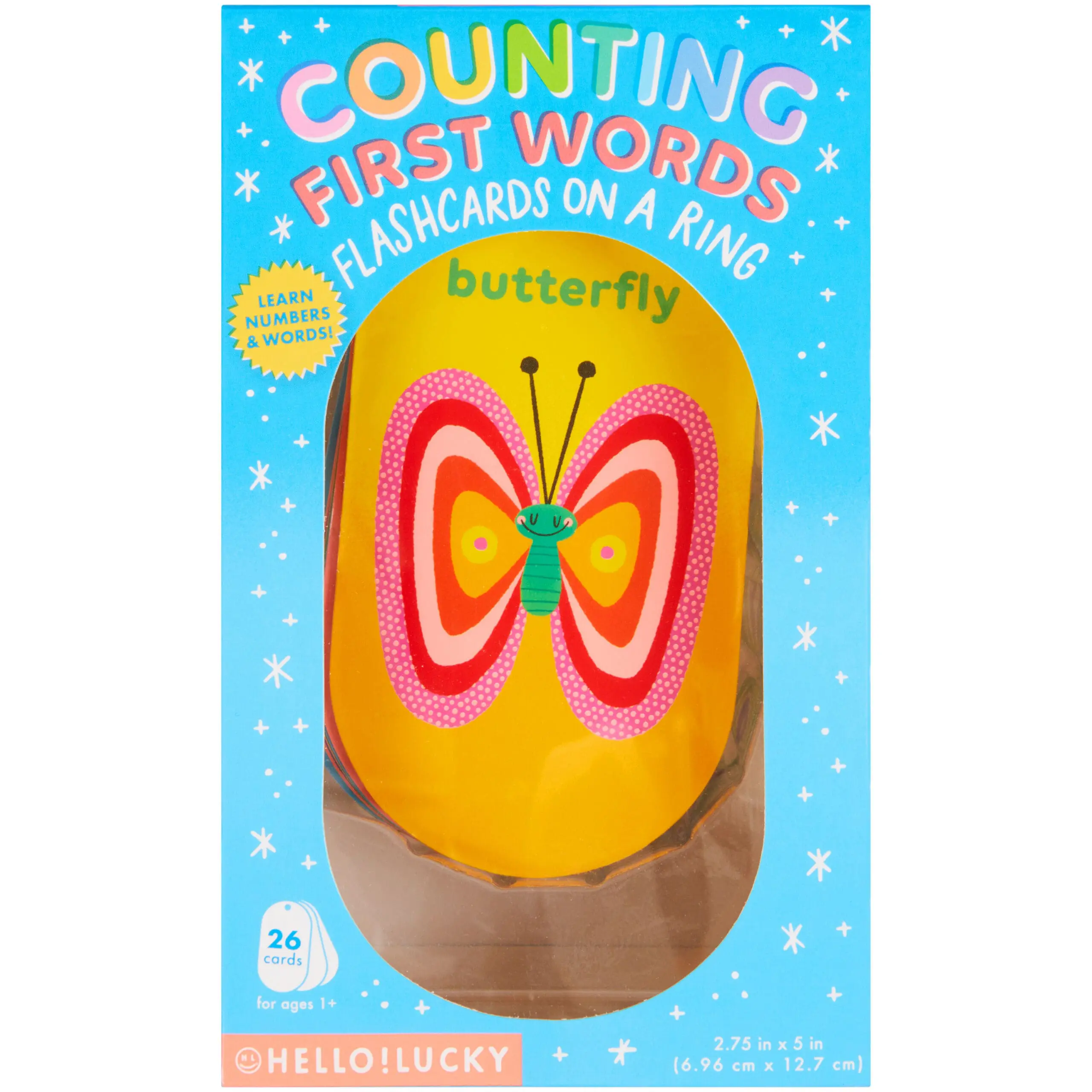 Each laminated card features sensory counting dots and joyful illustrations of familiar first words. 26 laminated flashcards on a plastic ring. Ages 1+.