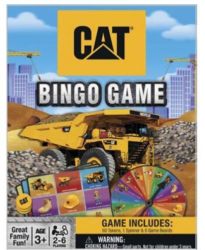 This Caterpillar Bingo Game puts a construction site spin on the family favorite. Make all 9 matches and be the first to shout BINGO! Bingo Game includes 1 spinner, 6 gameboards, and 60 custom tokens. For 2-6 players. Perfect for ages 3 and up.