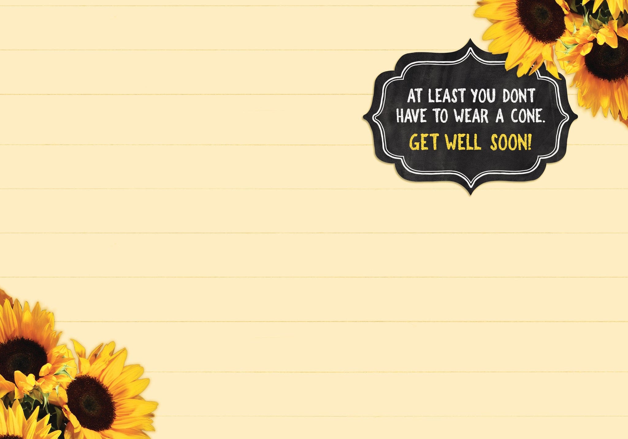 Each card measures 5″x7″ (13cmx18cm) and is printed in full colour on coated paper, comes with a coordinating colour envelope. Printed in Canada. Inside greeting: at least you don’t have to wear a cone. Get Well Soon!