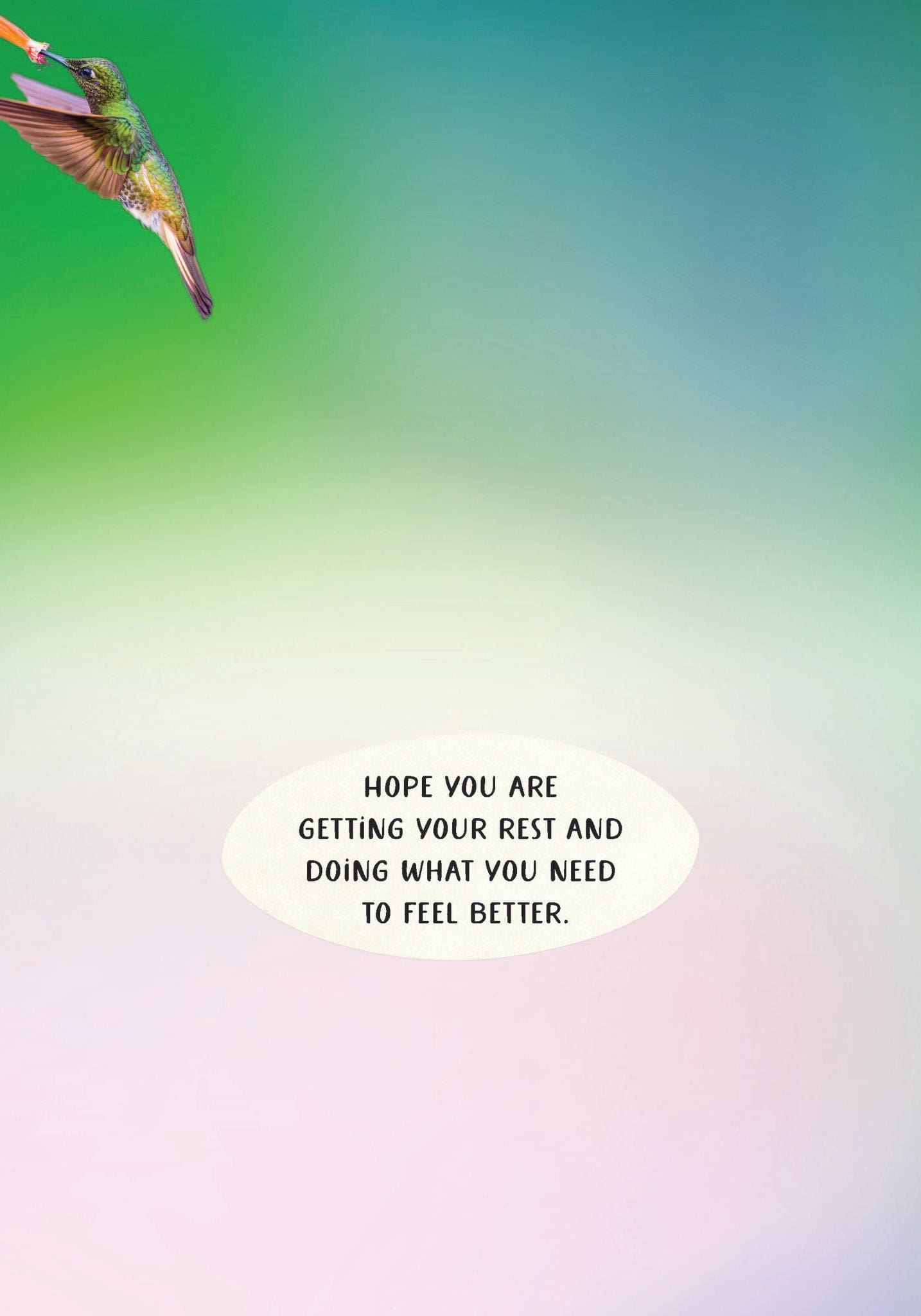 Each card measures 5″x7″ (13cmx18cm) and is printed in full colour on coated paper, comes with a coordinating colour envelope. Printed in Canada. INSIDE: Hope you are getting your rest and doing what you need to do to feel better.