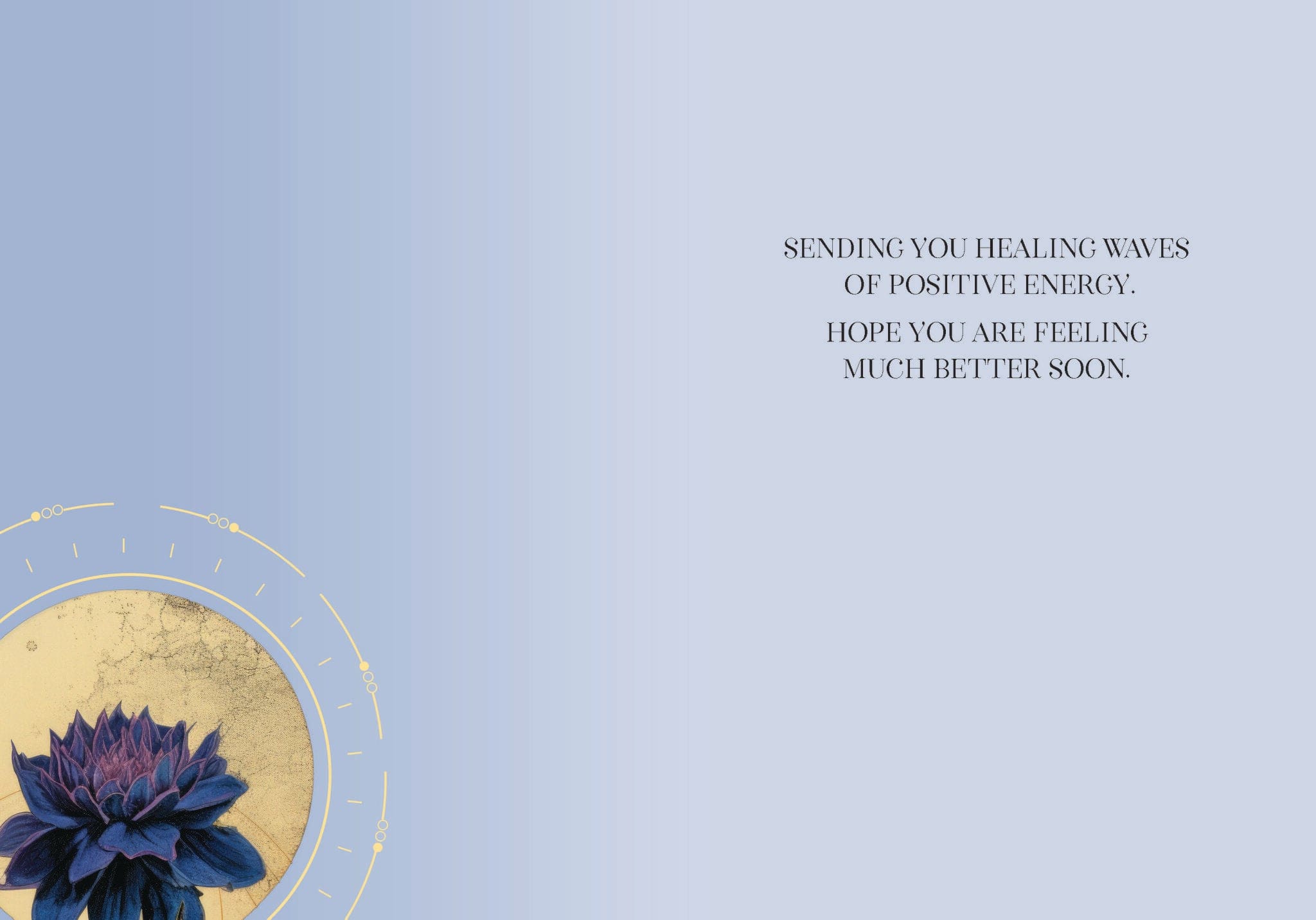 Each card measures 5″x7″ (13cmx18cm), printed in full colour on watercolour paper, comes with a coordinating colour envelope. Printed in Canada. Inside greeting: Sending you healing waves of positive energy. Hope you are feeling much better soon.