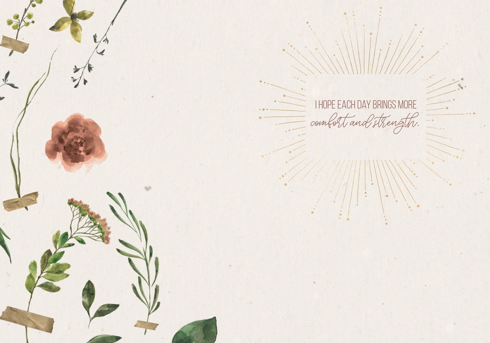 Each card measures 5″x7″ (13cmx18cm) and is printed in full colour on watercolour paper, comes with a coordinating colour envelope. Printed in Canada. Inside greeting: I hope each day brings more comfort and strength.