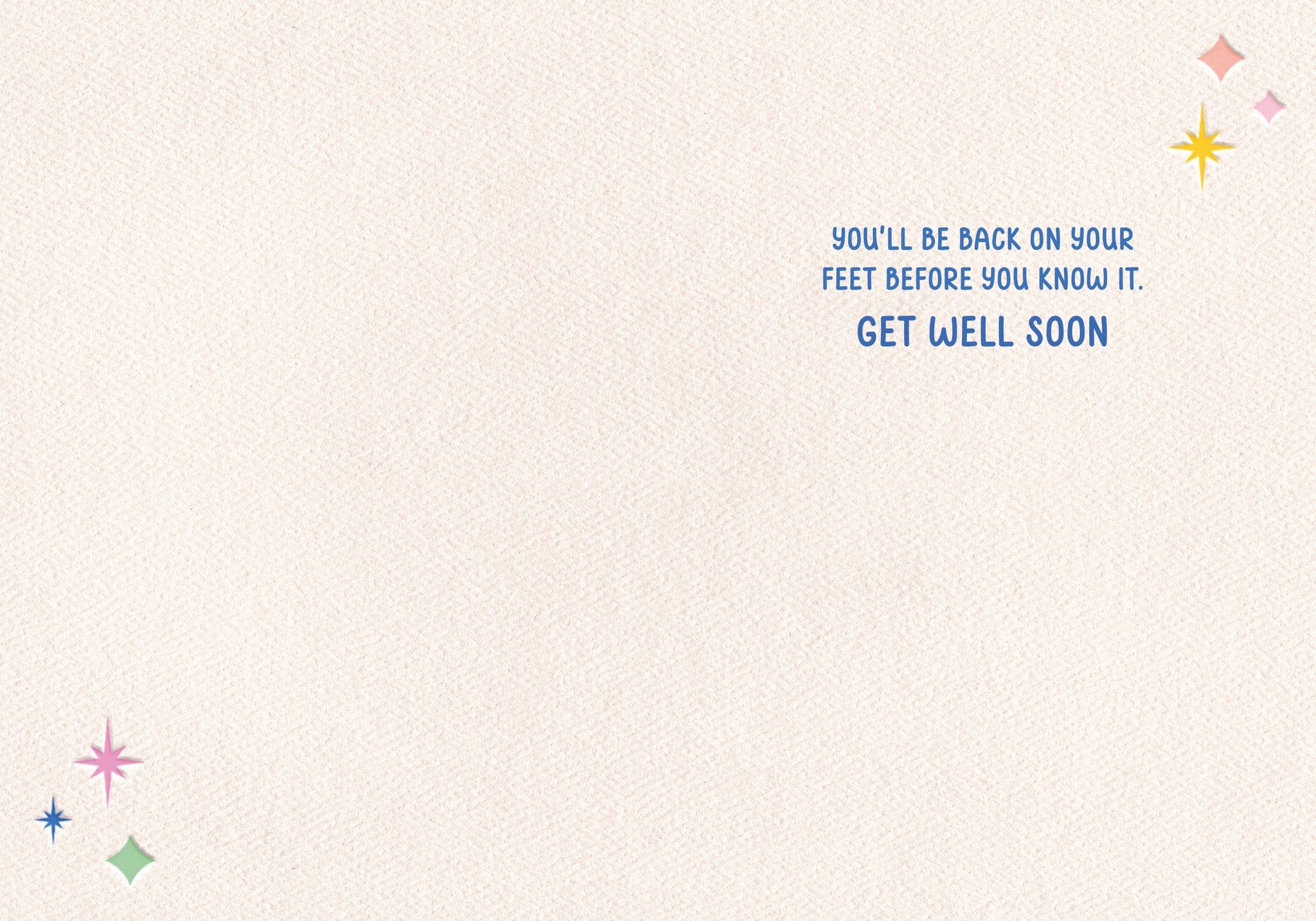 Each card measures 5″x7″ (13cmx18cm) and is printed in full colour on linen paper, comes with a coordinating colour envelope. Printed in Canada. Inside greeting: You’ll be back on your feet before you know it. Get Well Soon