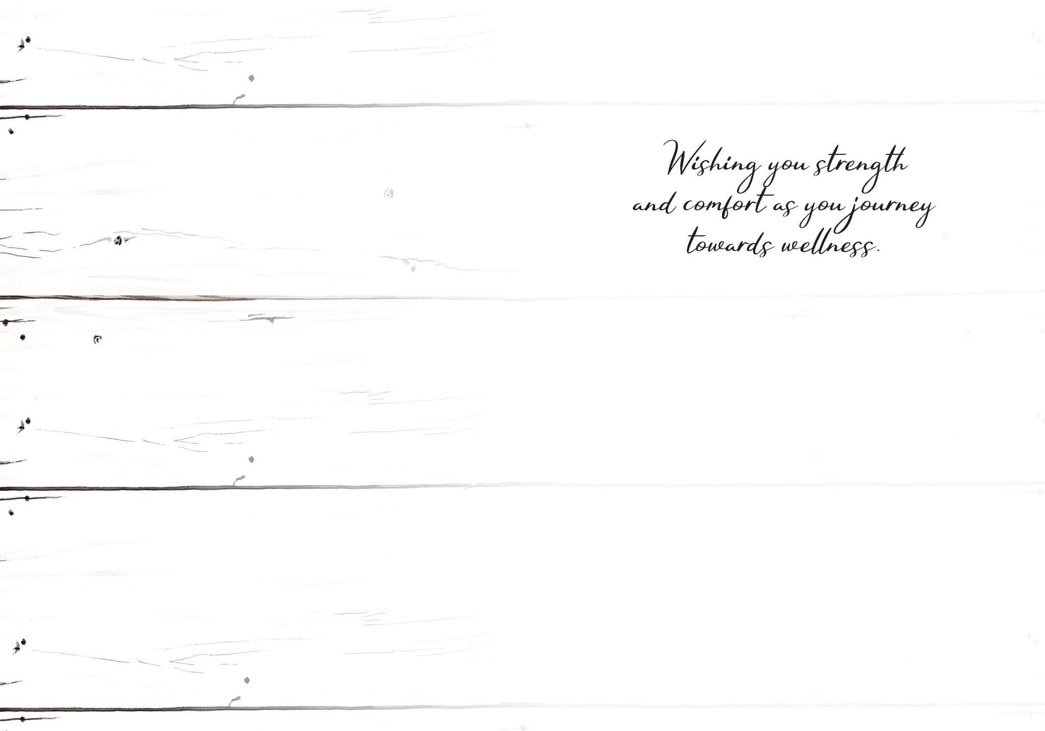 5″x7″, printed on linen paper, with coordinating envelope. Printed in Canada. Inside greeting: Wishing you strength and comfort as you journey towards wellness.