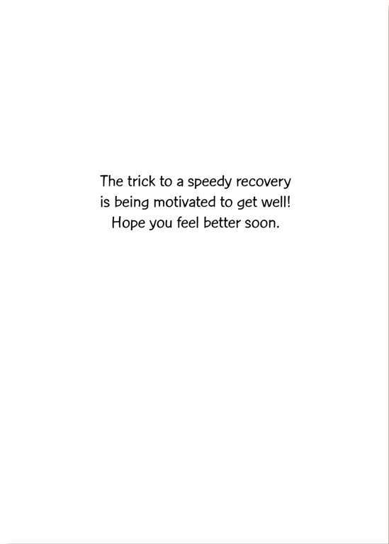 Each card measures 5″ x 7″ and is paired with a white envelope. INSIDE: The trick to a speedy recovery is being motivated to get well! Hope you feel better soon.
