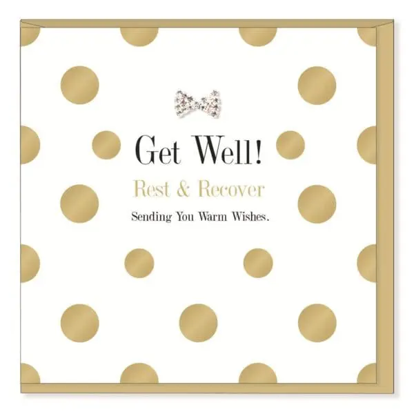 Mad Dots Cards. This 15cm x 15cm greeting card is printed on cardstock, features gold foil details and is embellished with a diamante jewel. Cellophane wrapped with a pearlescent gold envelope. Made in England. INSIDE: Blank