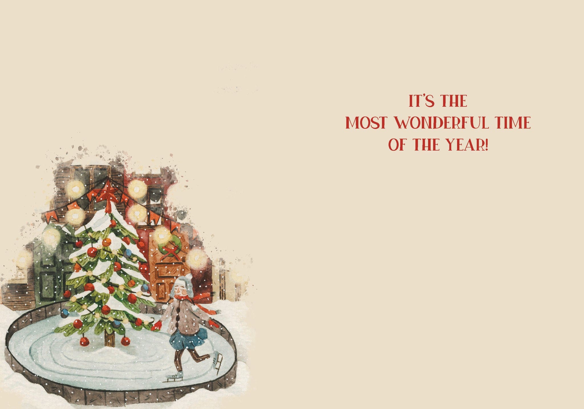 Each card measures 5″x7″ (13cmx18cm) and is printed in full colour on linen paper, comes with a coordinating colour envelope. Printed in Canada. Inside greeting: It’s the most wonderful time of the year!
