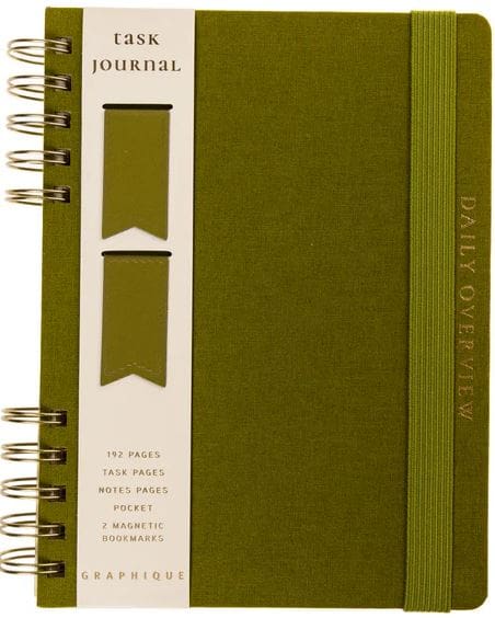 6″ x 8″ hardbound journal features book cloth cover, twin spirals on side, and elastic closure. Includes 192 lined pages and 2 magnetic bookmarks.