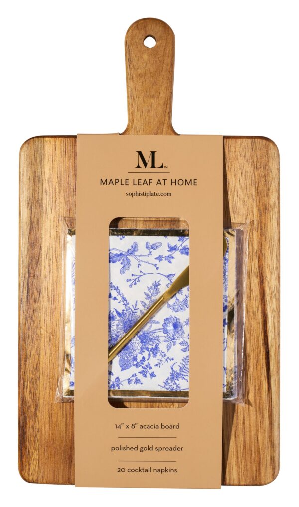 14×8” Acacia Board w/ Handle Gold Spreader, Timeless Napkin