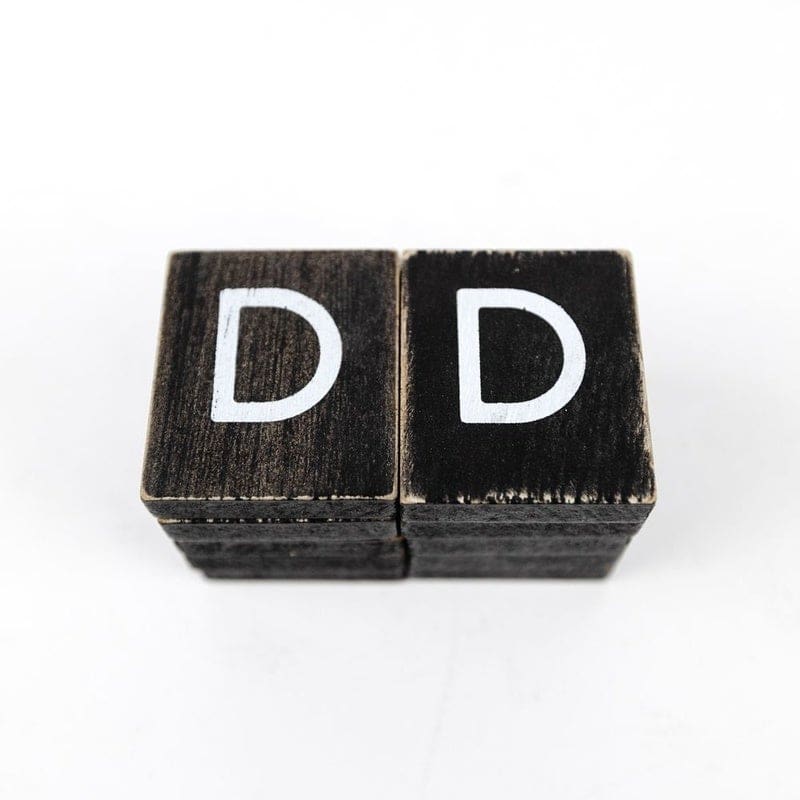 Set of 10 wood letter D tiles. Each tile measures 1.5″x 1.75″x 0.25″. Black with white writing. Letterboards sold separately.