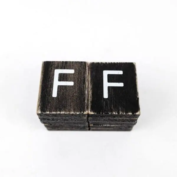 Set of 10 wood letter F tiles. Each tile measures 1.5″x 1.75″x 0.25″. Black with white writing. Letterboards sold separately.