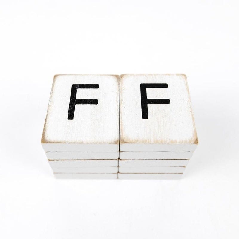 Set of 10 wood letter F tiles. Each tile measures 1.5″x 1.75″x 0.25″. White with black writing. Letterboards sold separately.