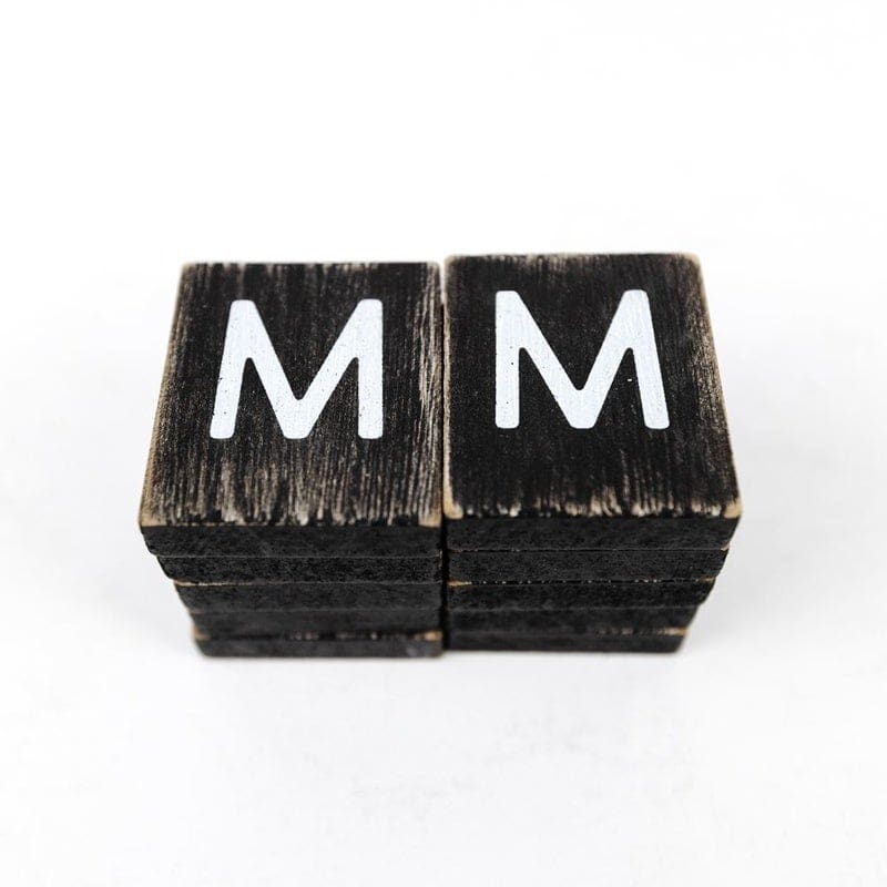 Set of 10 wood letter M tiles. Each tile measures 1.5″x 1.75″x 0.25″. Black with white writing. Letterboards sold separately.