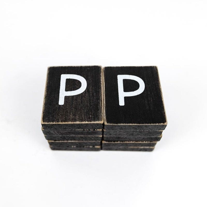 Set of 10 wood letter P tiles. Each tile measures 1.5″x 1.75″x 0.25″. Black with white writing. Letterboards sold separately.