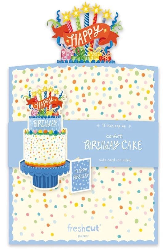 Cue the confetti! Celebrate with this vivid and playful two-tiered paper confection. Cake pops up to 12″ high and 7″ wide. Includes envelope, pop-up cake and blank notecard.