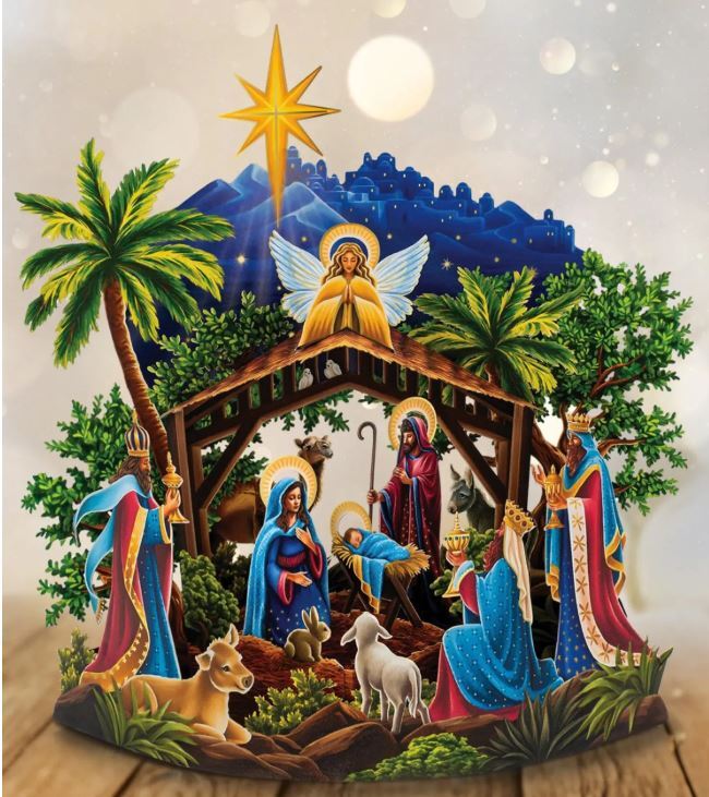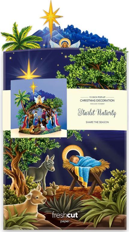 PREBOOK ONLY. Shipping late September 2025. Beneath Bethlehem’s glowing night sky, the evening of Christ’s birth comes to life in this spectacular 3D display.Includes envelope, pop-up bouquet and blank notecard. Measures 14.5″ x 14″.