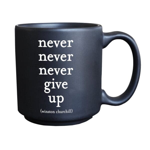 3 oz. ceramic matte finish mini mug. Microwave & dishwasher safe. Stackable.never never never give up