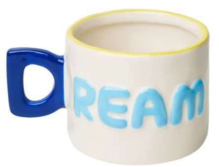 14oz ceramic mug with letter handle. Microwave and dishwasher safe.