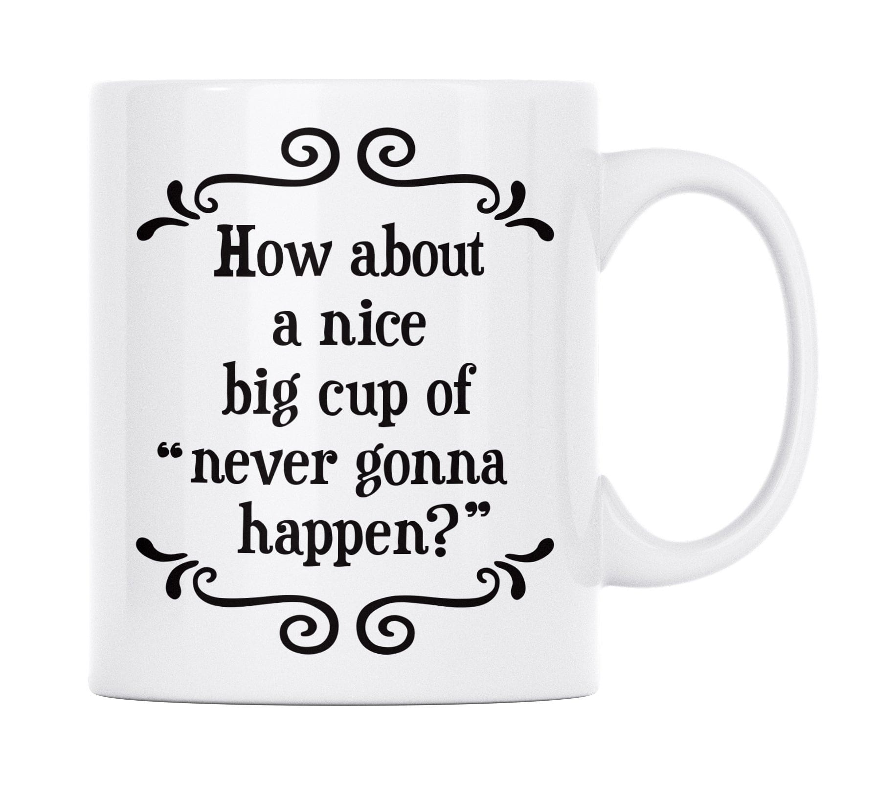 Durable 12 Oz. white mug with black text, READS: How about a nice big cup of “never gonna happen”?