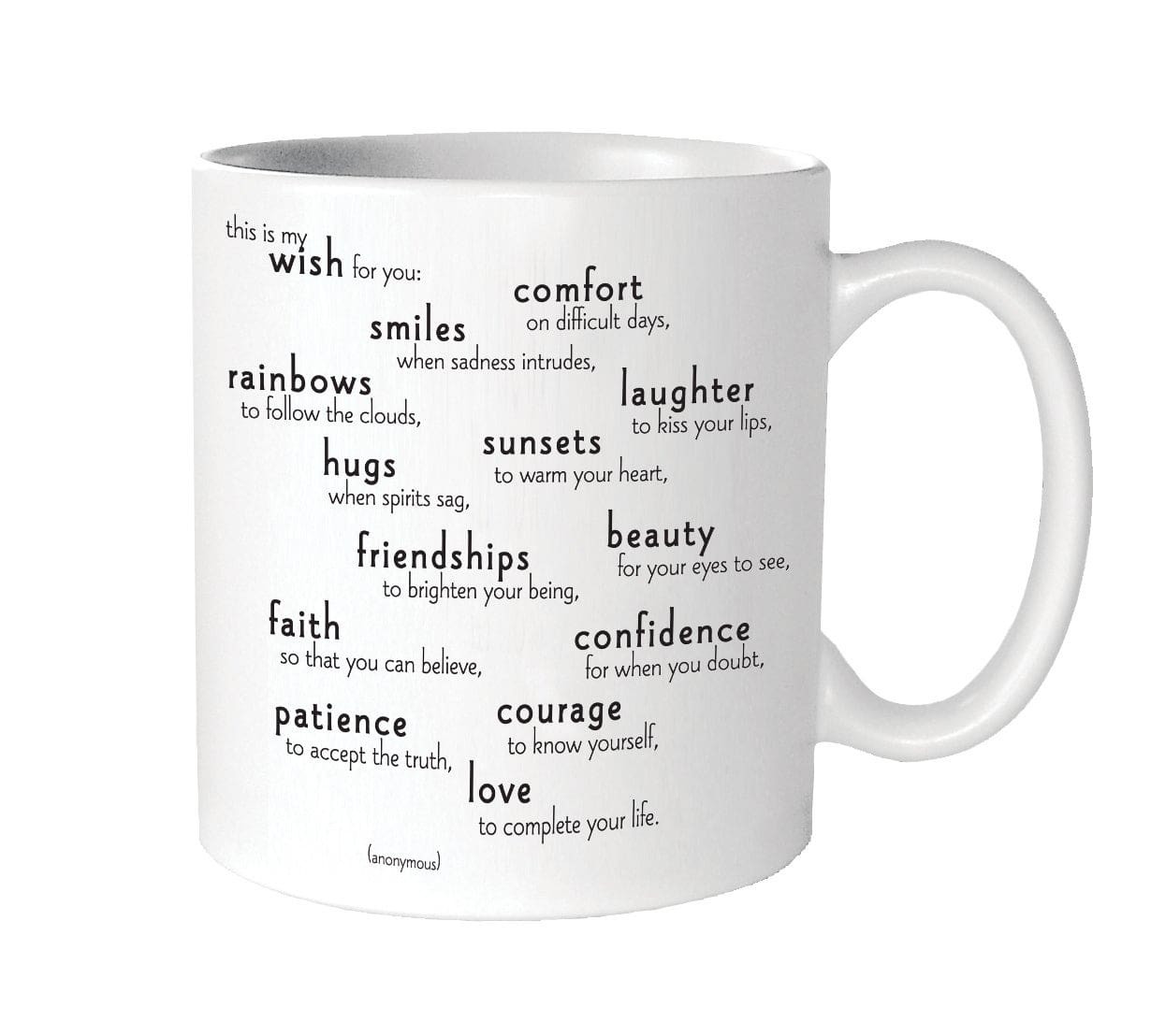14 oz. ceramic matte mug. Microwave & dishwasher safe/Indv boxed:this is my wish for you: comfort on difficult days, smiles when sadness intrudes, rainbows to follow the clouds, laughter to kiss your lips, sunsets to warm your heart/etc