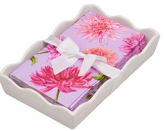 Crafted from crisp white ceramic with softly wavy edges, this holder brings a touch of sophistication to your bar card, buffet, or coffee tables. Holds 4.5″ x 8″ guest napkins. Includes 1 pack of Dahlia Garden napkins (20 napkins/pack).